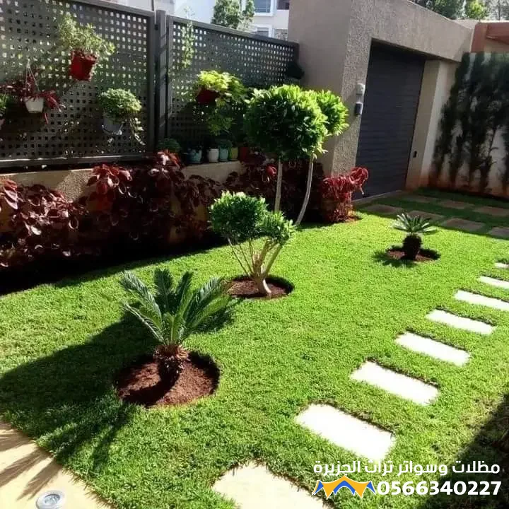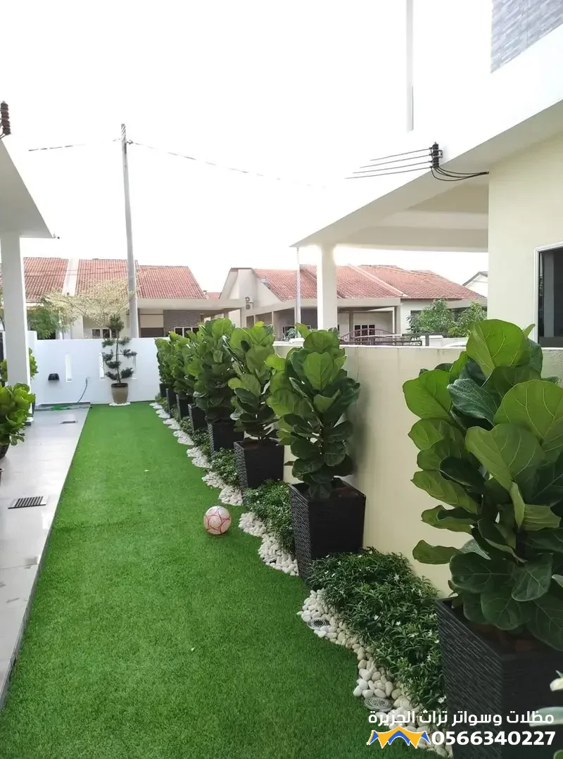 - العشب: يمكن استخدام العشب الصناعي كحل عملي يتطلب صيانة أقل وتبريداً للسطح، أو اللجوء إلى العشب الطبيعي في مساحات محدودة بعمق تربة كافٍ ونظام تصريف محكم.