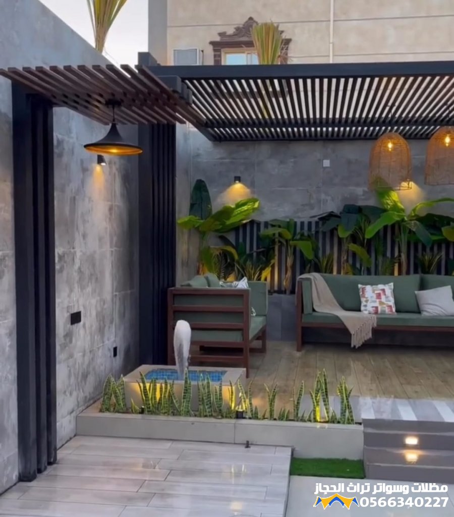 في الاخير:تُستخدم البرجولات الخشبية الكلاسيكية ذات الأعمدة المتينة، والتي يمكن إغلاقها بذكاء بالزجاج أو المشمع للحماية. تكتمل الأجواء بـالأحواض الحجرية الكلاسيكية ونوافير المياه، وإضافة الإضاءة الدافئة والفوانيس لتعزيز الأجواء الحميمة والفاخرة. الهدف هو خلق واحة خارجية خالدة تجمع بين الرفاهية والسكينة.